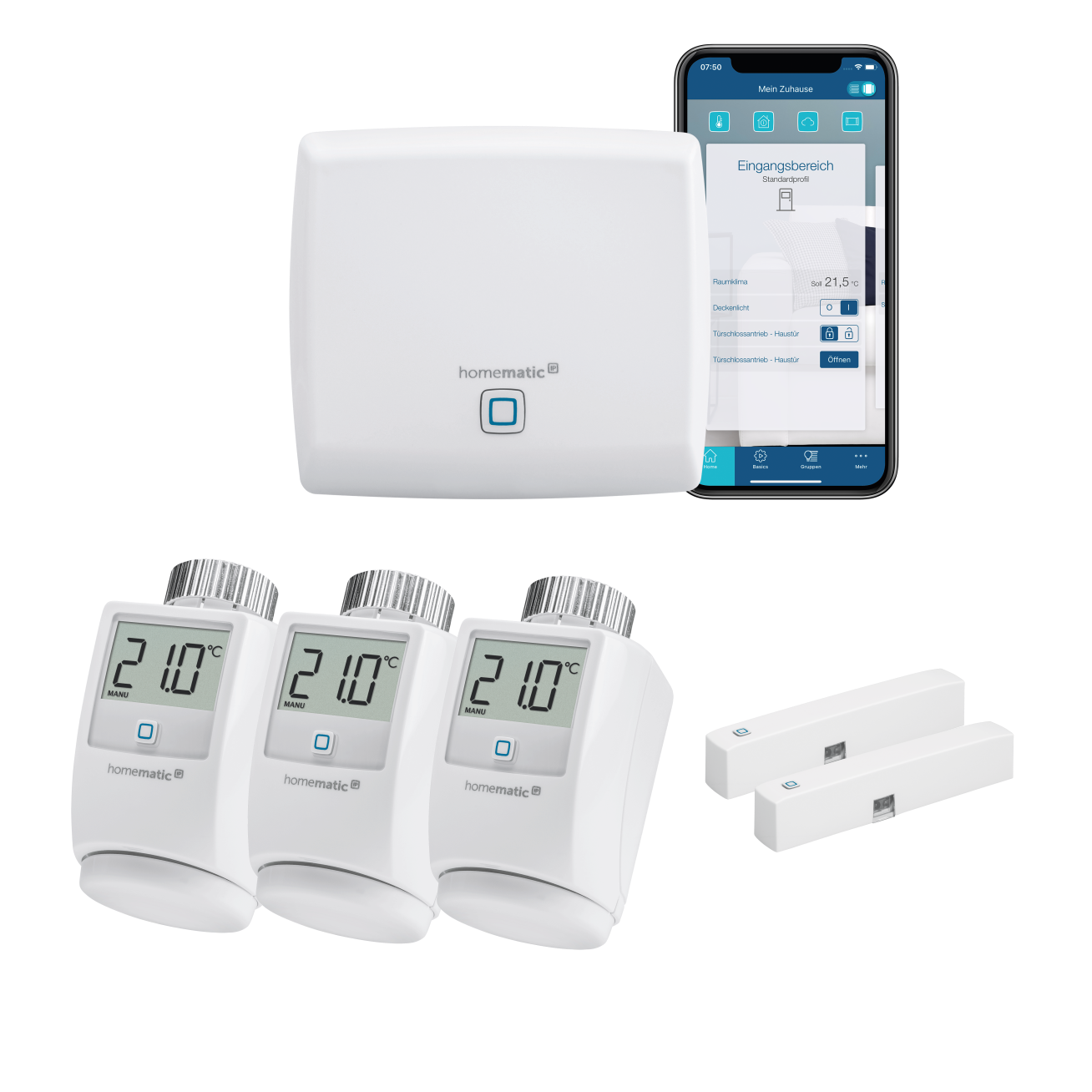 Das Paket beinhaltet die Smart Home Zentrale, den Homematic IP AccessPoint, sowie drei Heizkörperthermostate und zwei optische Fenster-/Türkontakte.